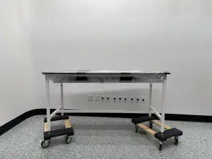 This laboratory workbench features a durable metal frame designed to support various scientific workflows, making it suitable for biotechnology, molecular biology, and clinical diagnostics environments. The black work surface provides a robust area ideal for benchtop equipment setup and sample preparation. Two overhead shelves offer additional organized storage for reagents, instruments, or bioprocessing tools, optimizing bench space.