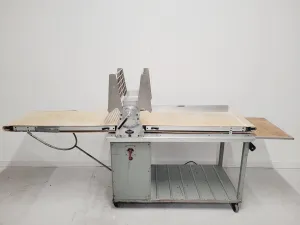 The Seward Rondo Type KDWn 094 Dough Sheeter, previously utilized in a commercial kitchen, demonstrates signs of substantial wear, particularly on its dual pastry belts. Despite this wear, the operational efficacy remains intact, with all functions tested and working efficiently. This pastry brake allows precise control over the dough thickness, adjustable between 0.5 cm and 25 cm, thanks to its roller height lever. It features an aluminum flour tray with dimensions of 48 cm x 12 cm x 7 cm, a working height of 90 cm, and a retractable wooden shelf measuring 60 cm x 40 cm. The machine boasts a working width of 90 cm, extending to a length of 275 cm when the shelf is expanded, and stands at a height of 115 cm. Additionally, a storage compartment beneath the belt area, measuring 88 cm x 65 cm x 65 cm, provides convenient storage solutions.