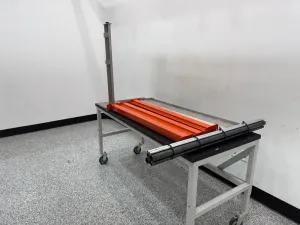• The parts are organized on a wheeled metal assembly table with dimensions approximately 72" (L) x 30" (W) x 36" (H), facilitating easy mobility and workstation adaptability.