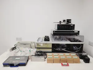 This Skalar San+ Segmented Flow Wet Chemistry Autoanalyser System, previously owned by a university lab, was deemed surplus to their requirements. It powers up, though comprehensive system testing is not possible due to the absence of a PC and software. All components are securely packed in black flight cases. The system includes the Skalar San+ Segmented Flow Autoanalyser Type - 4000, which is mounted to the bottom half of the flight box. Also included are a Skalar Sampler Type - 1000, a Skalar Interface Type - 8503, a Skalar Reactor Type - 5521, and an HP Deskjet 930C Printer. Additional components, such as Skalar parts and tubing, are also present in the accompanying kit, with specific Skalar part numbers for detailed tracking.