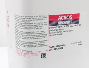 The Acros Organics Dowex 50WX8 100-200 mesh is a strong acid cation exchange resin designed for precision analytical separations, deionization, and sample preparation in biotechnology, molecular diagnostics, and chemical research. This resin features: