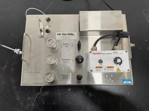 The Fluid Energy Aljet Jet Mill Base and Controller is a stainless steel laboratory and process milling system designed for precise particle size reduction using high-velocity pneumatic jets. This assembly integrates a mounted control module with visible pneumatic fittings, gauges, valves, and tubing, enabling accurate control and monitoring of milling parameters critical in biotechnology powder processing and molecular diagnostics workflows.