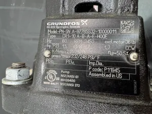 The Grundfos PN-SN A-97765532-10000011 is a vertical multistage centrifugal pump engineered for high-pressure industrial applications. Equipped with a Baldor Reliance industrial motor, this pump operates at a frequency of 60 Hz and voltage range of 115/208-230 V, offering reliable performance in demanding environments.