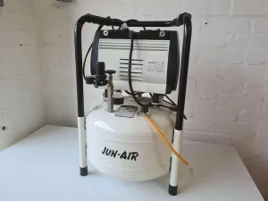The Jun-Air OF302-25B is a sophisticated, oil-free air compressor featuring a 25-liter pressure vessel mounted on durable frames. It comes equipped with a 5-micron filter regulator and an automatic water emptying system, facilitating numerous options for compressed air withdrawal. The compressor rests on adjustable rubber mounts, enabling flexible application and is suitable for retrofitting within existing systems. The horizontal mounting capability makes it an ideal choice for installation in OEM applications. This compressor boasts a dual-frequency driving motor ensuring optimal performance.