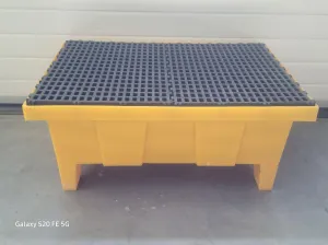 This robust plastic retention tank has a capacity of 70 liters, supported on four sturdy feet, and includes a plastic grating. Dimensions of the tank are 810 x 640 x 340 mm, designed for safely storing chemicals in cans or drums. It can evenly support a load of up to 100 kg. The tank is constructed from polyethylene and comes in a vivid yellow color for high visibility in laboratory or industrial settings.
