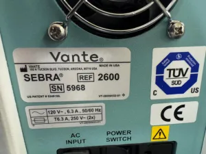 The Vante Sebra OMNI Sealer (Model SEBRA, Serial No. 5968) is a precision laboratory sealing instrument engineered for efficient and secure sealing of microplates and sample containers. Operating on 120 V and compatible with dual 50/60 Hz frequency standards, this device supports typical laboratory electrical environments. The apparatus draws 6.3 A power and incorporates dual T6.3 A, 250 V fuses for electrical safety.