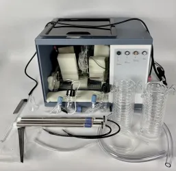 The Aquatron® A4000D offers fully automatic operation directly from a potable water supply. Alternatively, it can connect to any pre-treated water source using an optional water feed conversion kit. It features a distillate storage level control switch compatible with any collection reservoir. The system includes a double coil condenser and boiler, utilizing a VYCOR® silica glass sheathed heating element to deliver exceptionally high-quality, pyrogen-free distillate, although the distillate should be tested. These stills can also work with filter and deionization units, requiring the water feed conversion kit (Cat. No. 171-1210).