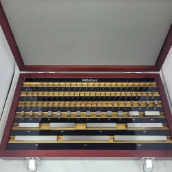 This Mitutoyo BM1-8-1B/PD Gauge Block Set, consisting of 81 pieces, is crafted from a high-chromium alloy steel with an ultra-micro-lapped surface finish, ensuring precision and long-term durability. Each block undergoes careful heat treatment and stress-relief processes, providing remarkable wear resistance, stability, and wringing performance. Suitable for high-precision calibration, inspection, and tooling environments, this set meets or exceeds all internationally recognized standards, including ASME, ISO, and JIS, offering a level of flatness, parallelism, and surface finish that often surpasses governmental specifications. It is in full working condition and available for immediate delivery.