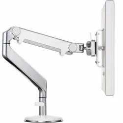 These dual monitor arms enhance ergonomic alignment and workspace efficiency by securely supporting two monitors up to 33 lb each. Clamp mounting allows stable installation on desk edges, optimizing office or laboratory setups. The polished aluminum and white finish provides a durable and professional aesthetic.