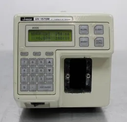 The Jasco UV-1570M Intelligent UV-Vis Spectrophotometer is a laboratory-grade analytical instrument designed for precise ultraviolet and visible light absorption measurements critical in molecular diagnostics and biotechnology research. Manufactured in Japan, this unit operates on 240V with dual frequency support (50Hz/60Hz) to accommodate various lab power standards. Although a used instrument, it has undergone functional testing and is confirmed fully operational. The compact device weighs approximately 12 kg (26.46 pounds) and features an intelligent detection system optimized for spectral analysis in biochemical and bioprocessing workflows.