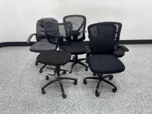 This lot includes five rolling office chairs designed with ergonomic features to enhance comfort during extended use in office and laboratory environments. The chairs vary in design, including mesh-back and cushioned leather-like upholstery options, supporting diverse user preferences. Each chair is equipped with: