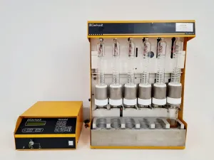 The Gerhardt Soxtherm S306A SE-3A Extraction System coupled with the SE-VA Variostat Controller has been decommissioned from a university laboratory where it was no longer needed. While the main unit powers on via the controller, operational control is compromised. The equipment demonstrates fair physical condition with aging evidence, such as rust on the springs, yet retains intact glass components and coils. Offered for spare parts or repair due to its working and cosmetic state. Specifications include a Gerhardt Variostat Controller, Model SE-VA, S/N 4012129, and a Gerhardt Soxtherm Extractor, Model S306A SE-3A, S/N 4012160.
